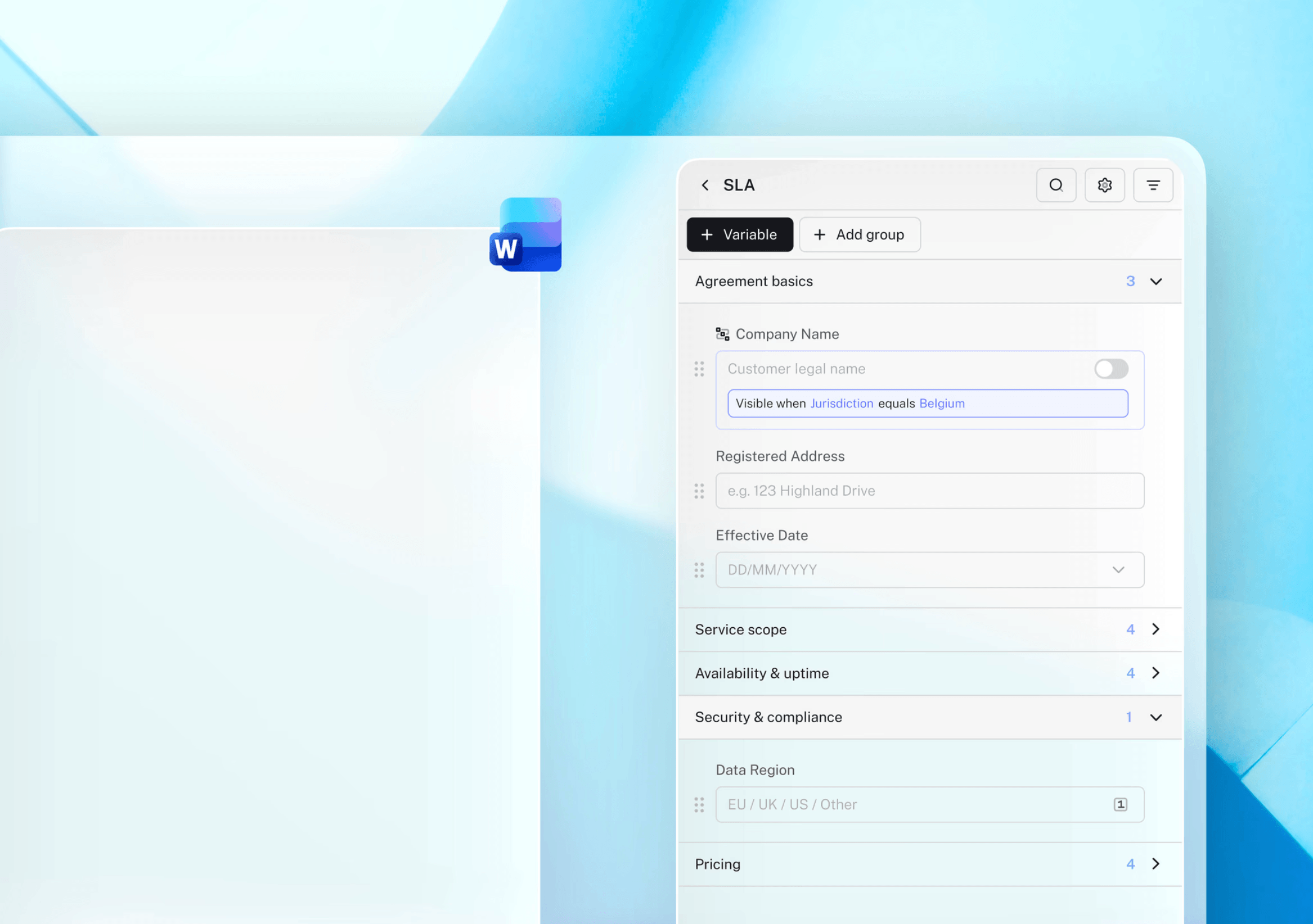 Upload your existing agreements and LEGALFLY convert them into smart templates in minutes, automatically detecting variables like party names, jurisdictions, and payment terms. Clause logic makes templates adaptive: provisions appear or are hidden based on the specifics of each deal, without any manual configuration. Every new contract starts from an approved structure, so consistency is built in from the first draft rather than checked for at the end.