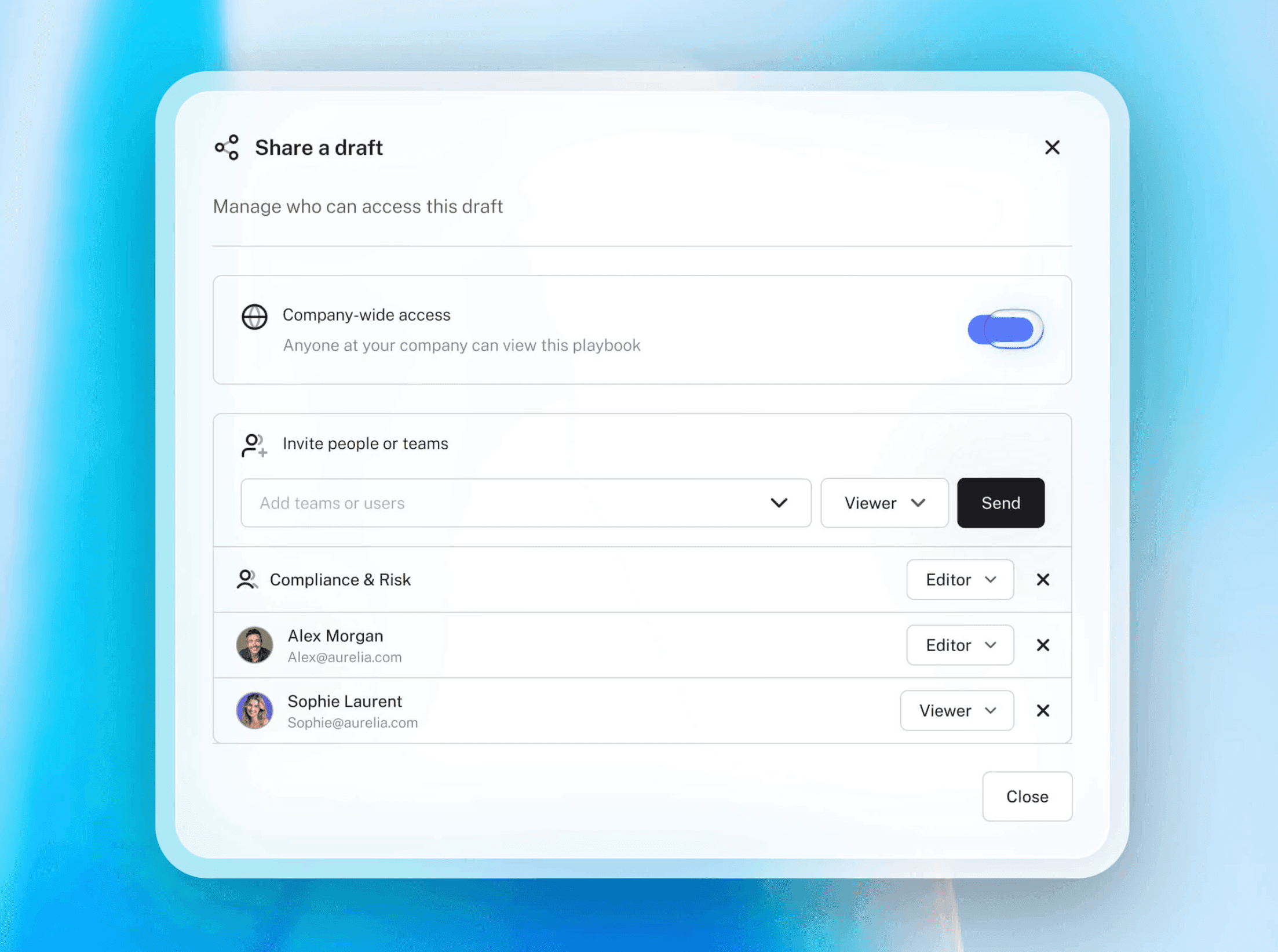 You draft, redline, and review without leaving the document. Tracked changes appear inline, the same way you'd expect them from a colleague. Business users can self-serve routine agreements using pre-approved templates, with guardrails that keep them within safe boundaries. Legal stays in control without becoming a bottleneck.