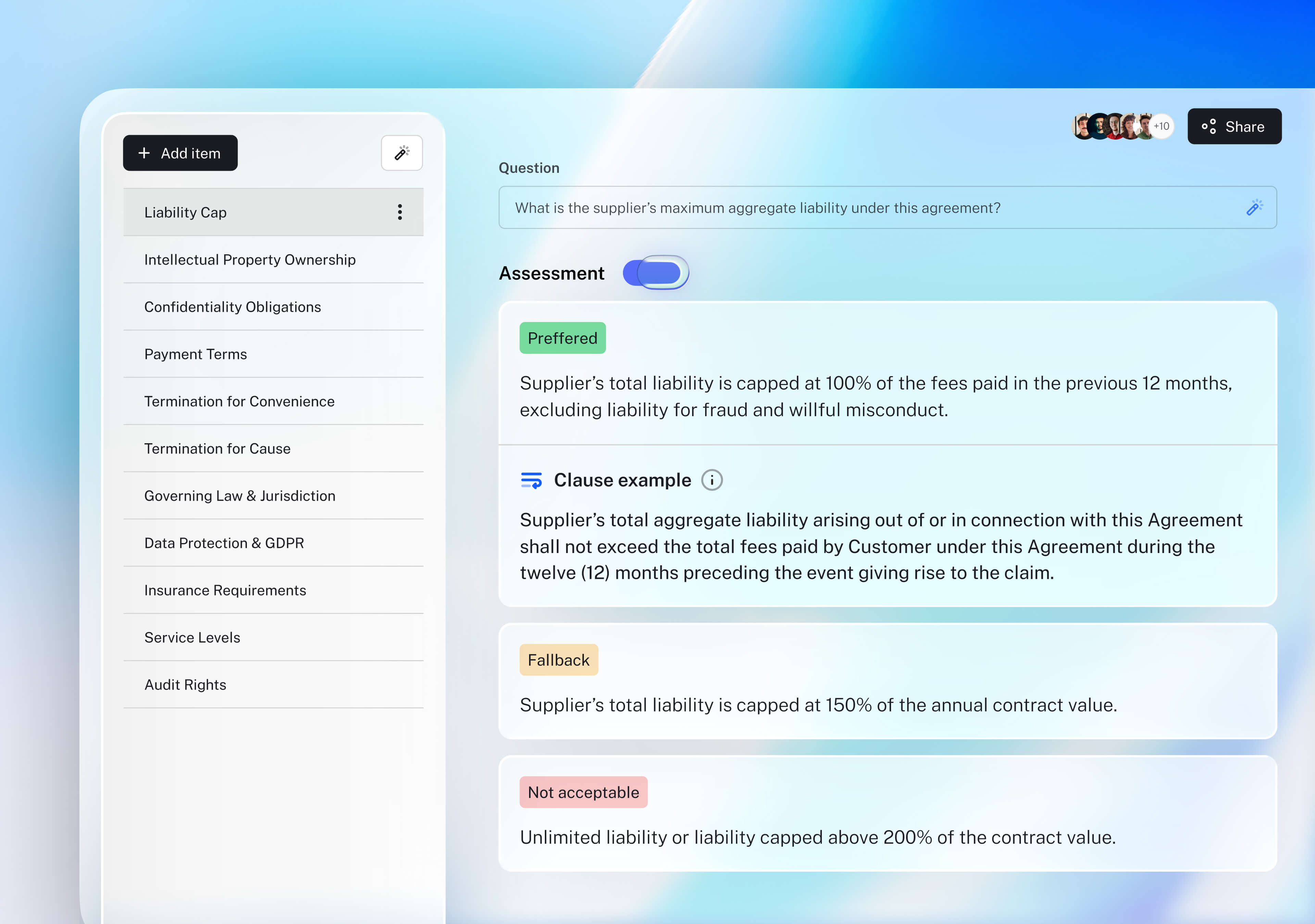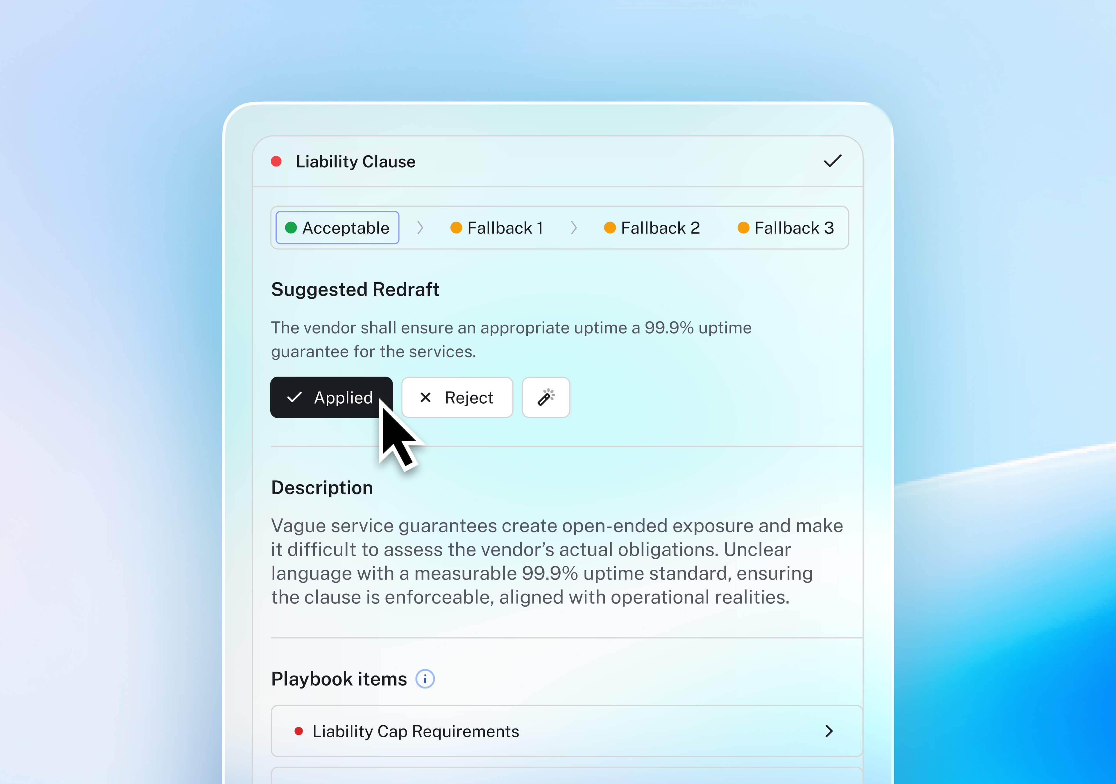 Apply your own playbooks or LEGALFLY’s pre-built standards to any contract.