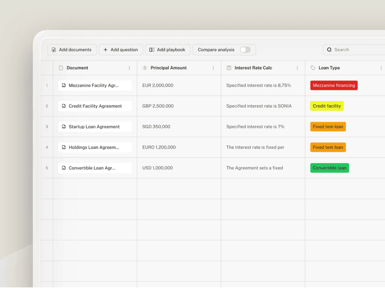 LEGALFLY’s multi review agent allows you to extract and analyse information from up to 100 documents at once.