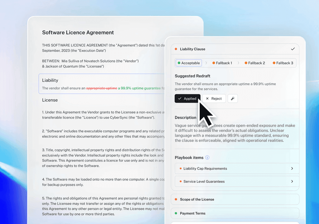 Trained on thousands of legal documents, the Review agent conducts checks and flags risks according to your personalised playbooks, approved by Legal. SEE IT IN ACTION.