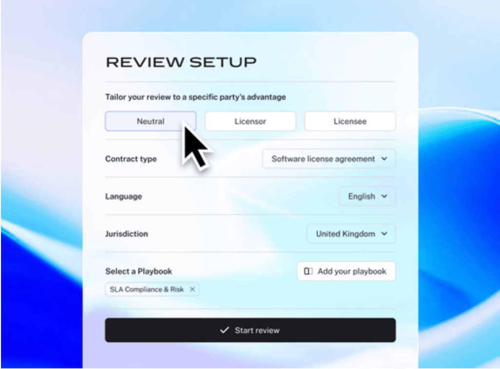 In-house teams can create playbooks specific to their own legal workflows and policies, enabling them to address high workloads while reducing reliance on external counsel. Clause logic and fallback positions are applied automatically based on jurisdiction, deal context, and risk profile, meaning the platform adapts to how your organisation actually operates rather than forcing you into a generic workflow.