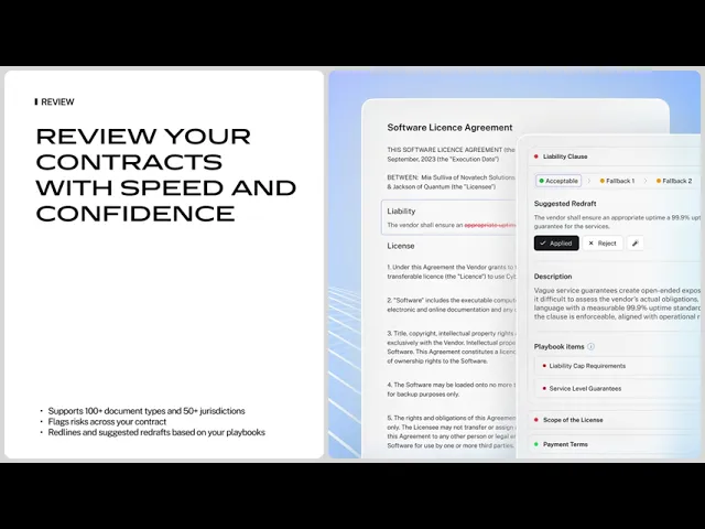 See how in-house teams are cutting contract review from two hours to 15 minutes. Book a demo with one of our experts.