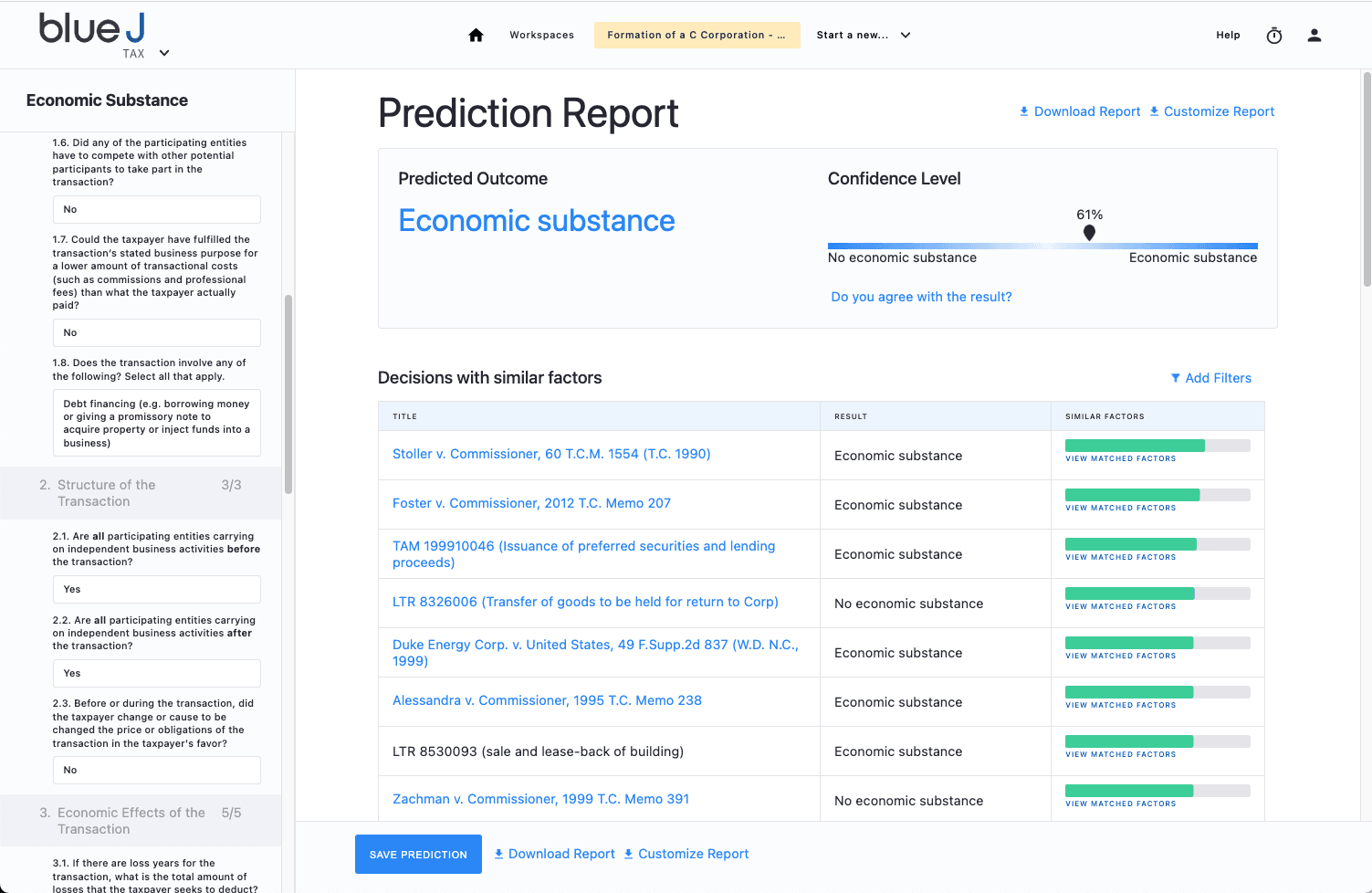 Predictive tax law insights: Blue J Legal offers predictive analytics specifically tailored to tax law, helping with the forecasting legal outcomes.