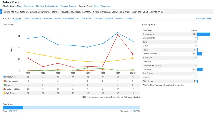 Insights into legal entities: The platform offers comprehensive data on opposing counsel and judges, assisting in understanding courtroom dynamics.