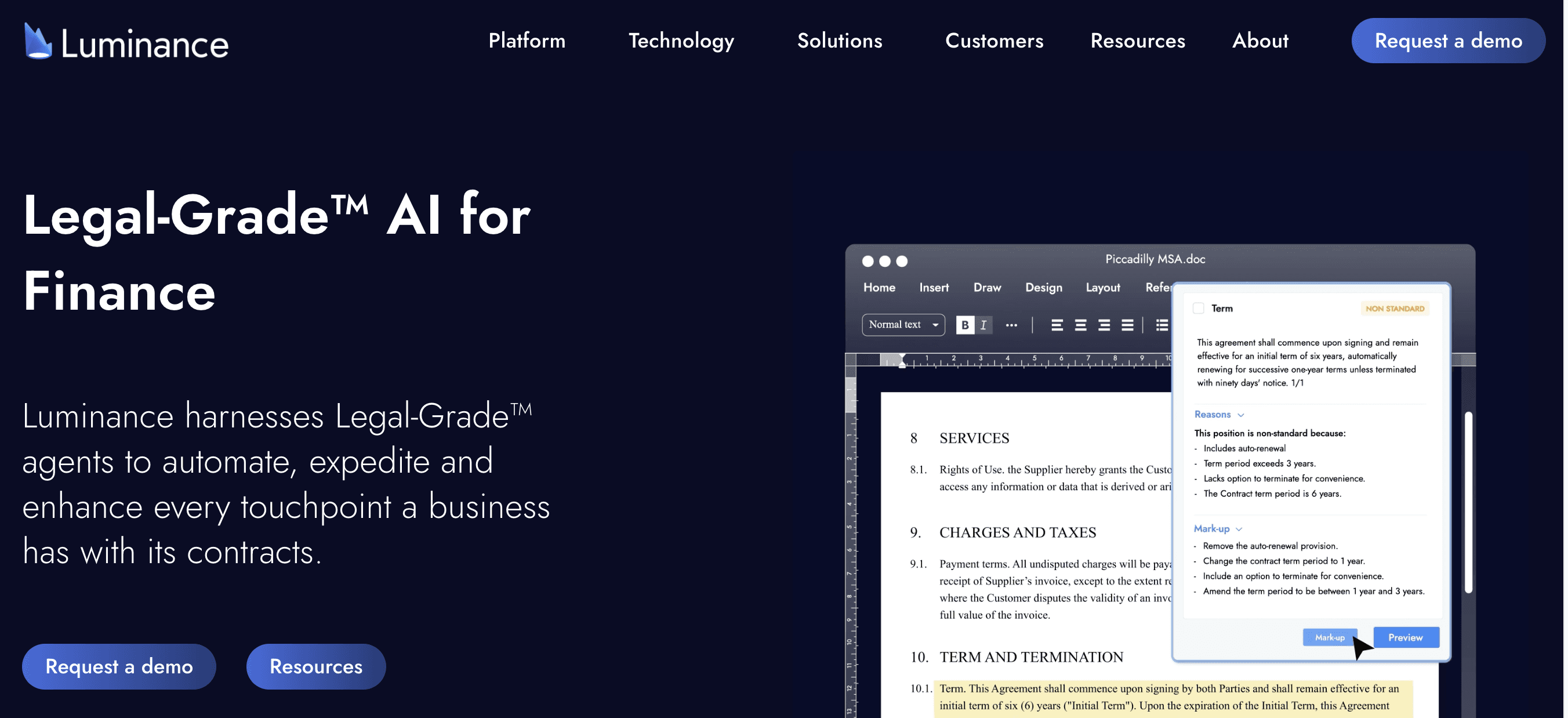 Luminance is a contract intelligence platform used to analyse, categorise, and monitor contracts across large repositories. It supports contract review, search, and compliance analysis. It is used by enterprises to gain visibility across contract estates and support large review exercises.