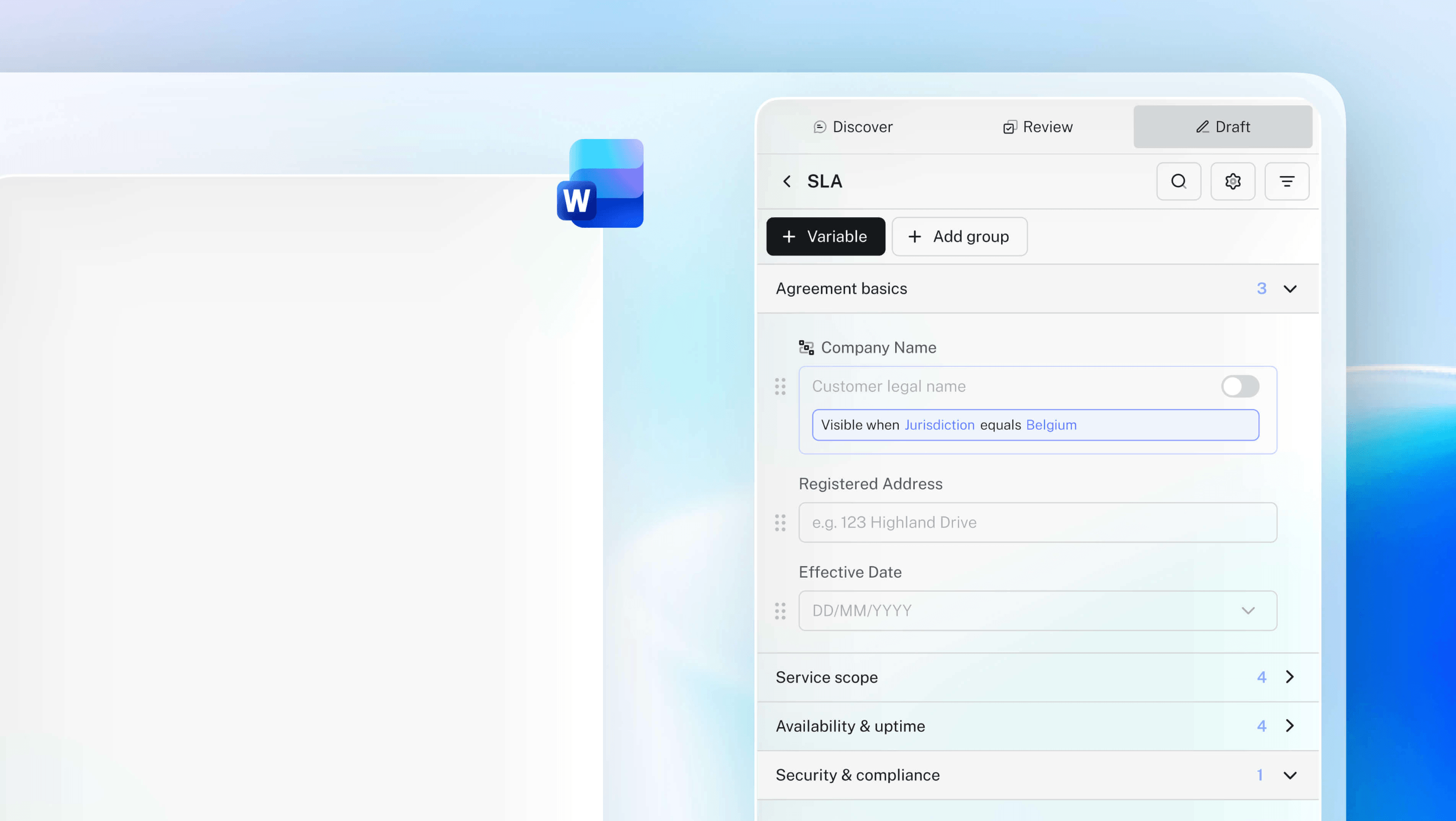 LEGALFLY's smart templates generate complete, compliant contracts in seconds from pre-approved structures. Upload existing agreements and the platform converts them into reusable templates, automatically detecting variables like party names, governing law, and payment terms. Every new contract starts from an approved baseline, with a reported 50% reduction in drafting time.