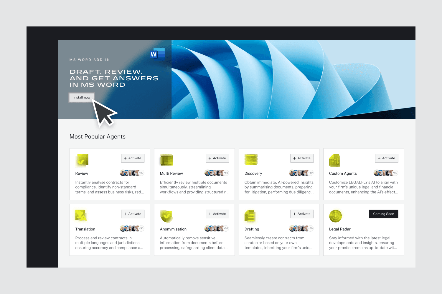 Agentic workflows: Configurable AI agents for reviewing, drafting, comparing, and discovery.