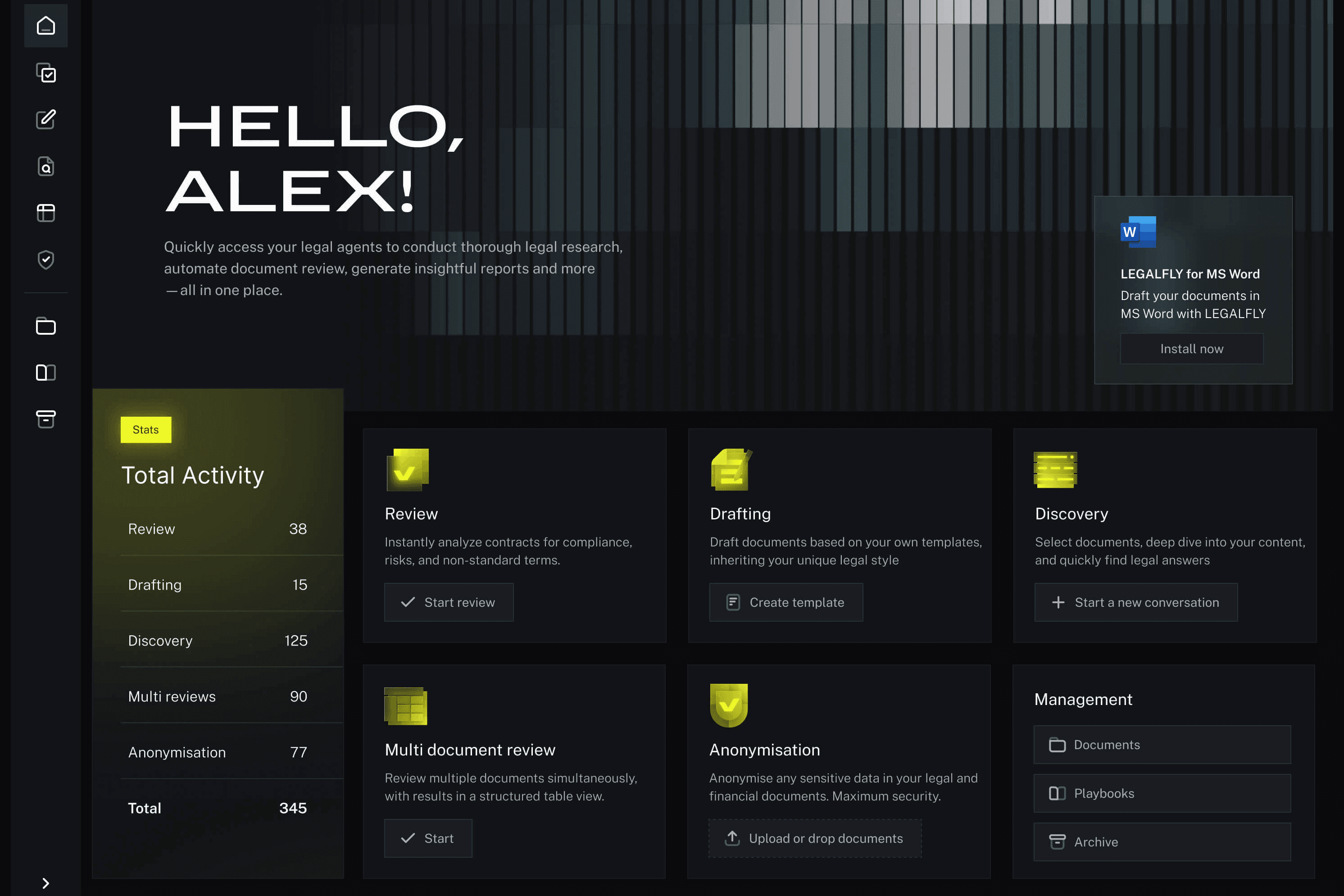 For in-house legal teams, the best fit is LEGALFLY. It is a secure legal AI associate, built specifically for corporate legal, compliance, and procurement functions. LEGALFLY integrates directly with Microsoft 365 and focuses on the operational tasks that consume the most time: comprehensive contract review, multi-document comparisons, and compliance checks. At the same time, agentic workflows extend into the broader role of the in-house lawyer, supporting due diligence, legal research, and drafting.