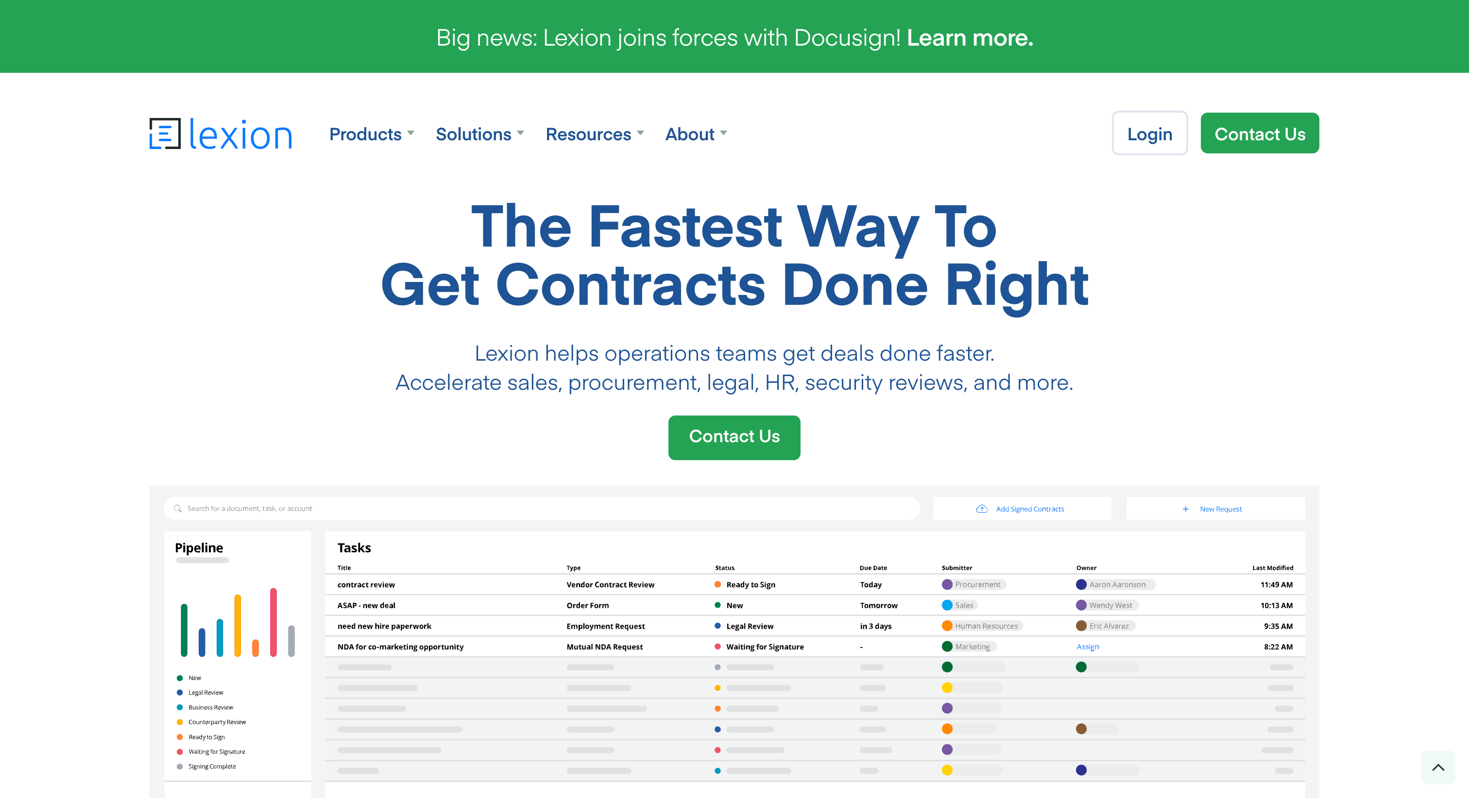 Lexion is a contract management platform designed for smaller in-house legal departments. It provides AI-powered tools for drafting assistance, negotiation support, and contract repository organisation. It is practical for teams building a legal practice without a CLM already in place and want to improve basic contract workflows.