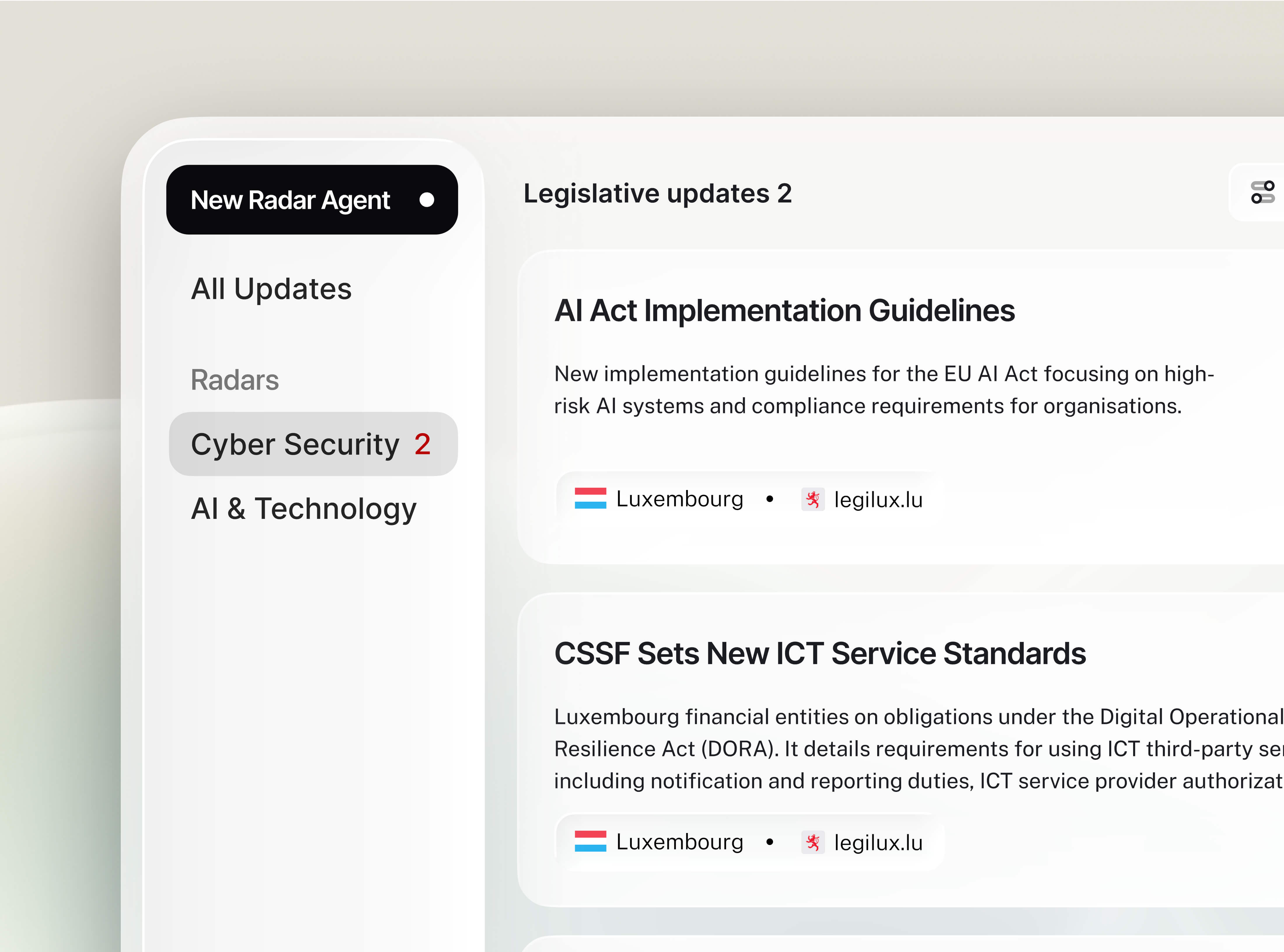Choose the jurisdictions, topics and frameworks that matter most. Get high-signal alerts in LEGALFLY or by email, no noise.