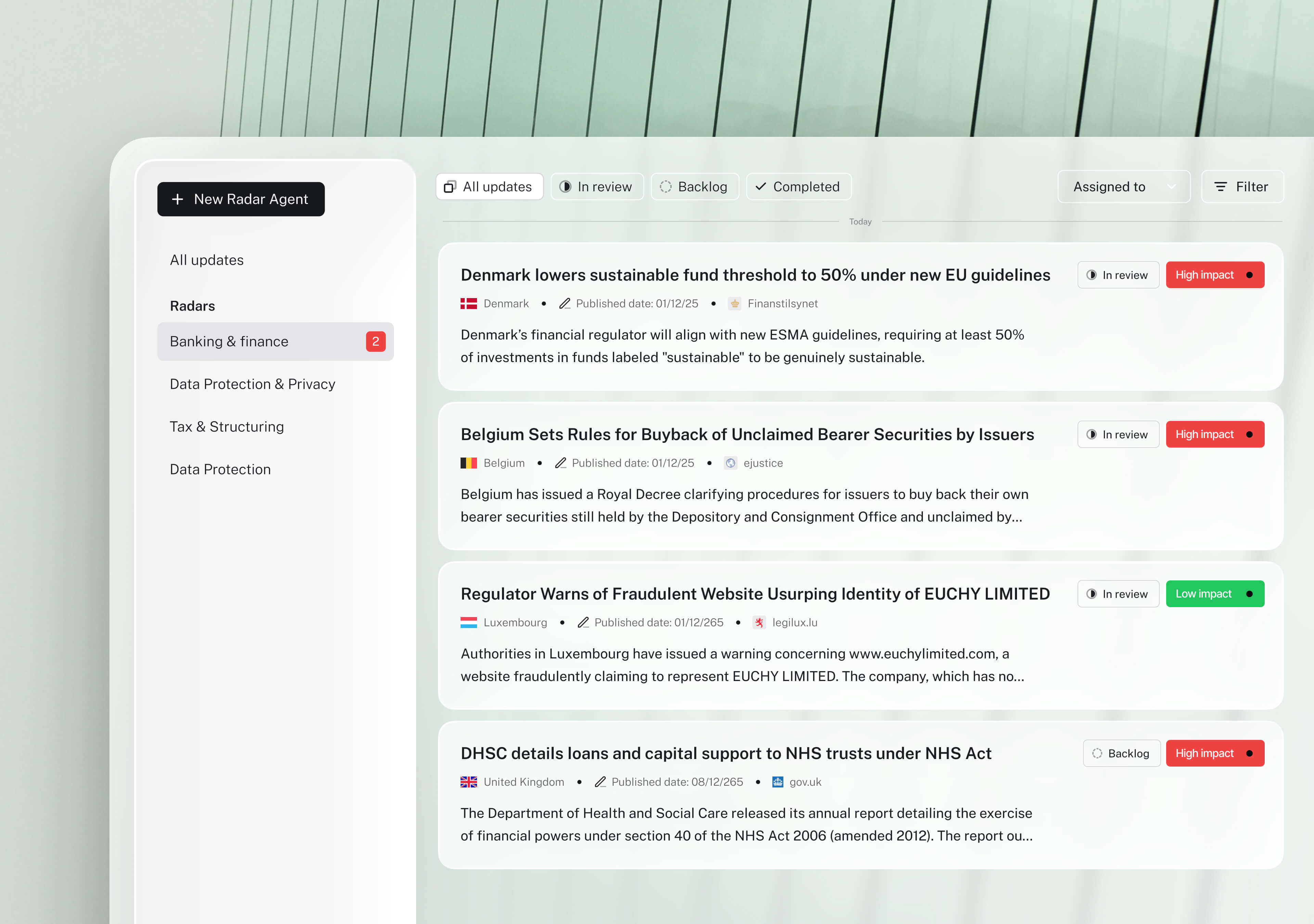Track new and upcoming rules across your key jurisdictions with alerts sourced from official regulators and publishers.